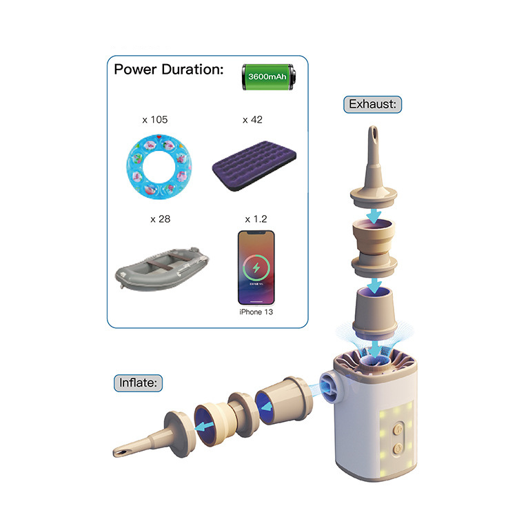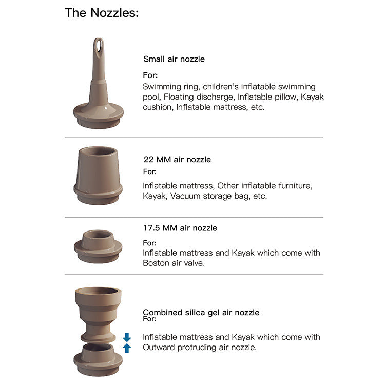 - 5 NOZZLES & DIVERSE USE - Come with 5 nozzles, the battery powered air pump is suitable for most small-large sized inflatable products, such as air mattresses, inflatable beds, pool floats, sleeping pads, swim rings, pool inflatables and other inflatable toys. Not only supports inflation, but also deflation air from the storage bags.