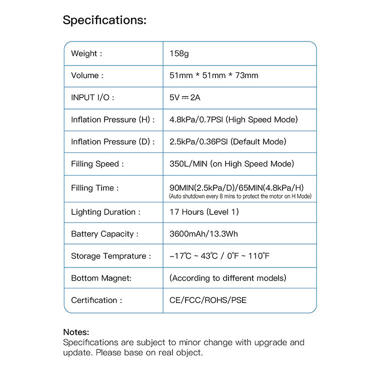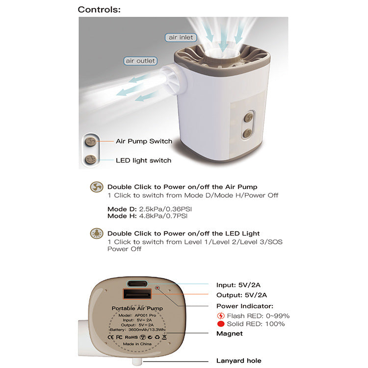 mobile charging. - MAGNETIC DESIGN & CAMPING LANTERN - The built-in magnet ring. Combined with the function of magnetic ring and camping light, our battery air pump can be fixed in more places to provide lightings, such as cars, iron frames, or other camping equipment.(Please make sure the material can be magnetically attracted)